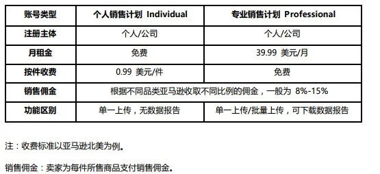亚马逊的账号类型主要分为两种,个人销售计划和专业销售计划。我们可以先通过下方的亚马逊北美站销售计划主要收费项目比对表来简单地了解一下两种账号类型的区别。