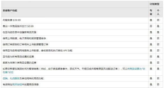 亚马逊官方对个人销售计划的定义为是,个人销售计划为即付即用计划,可提供访问基本商品信息和订单管理工具的权限,个人卖家可以通过将其商品与现有页面相匹配或在亚马逊目录中创建新页面,一次创建一种商品。 简而言之就是,无需月租,即付即用,卖出一件商品收你0.99美元,没出单就不用给钱,这算是个人销售计划的优势了。但是,个人销售计划无法使用批量销售工具和亚马逊MWS。批量销售工具指的是上传和下载各种数据报告、批量上传新产品等的功能。亚马逊MWS是指亚马逊商城网络服务,可上传数据、接收报告和执行其他 API 功能。 与之相对的,专业销售计划每个月需收取39.99美金的月租,但可以使用亚马逊的批量销售工具和MWS服务,也就是说,可以批量的上传产品,可下载各种数据报告。 有些小伙伴这时候可能会说,这么看来,专业销售计划似乎并没有比个人销售计划性价比高多少呀。我们再来看一下个人和专业销售计划之间的功能差别。