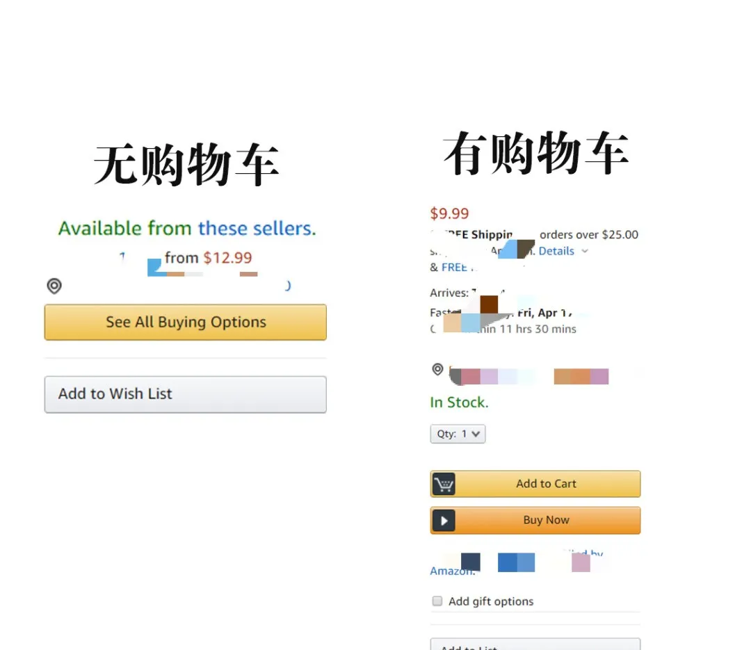 上面这张表我们就个重点来看看,个人销售计划没有资格获得购物按钮!这是什么概念?没有Buy Box,你的商品界面是像左边这样子的,而获得了购物车,是像右边这样子显示的: