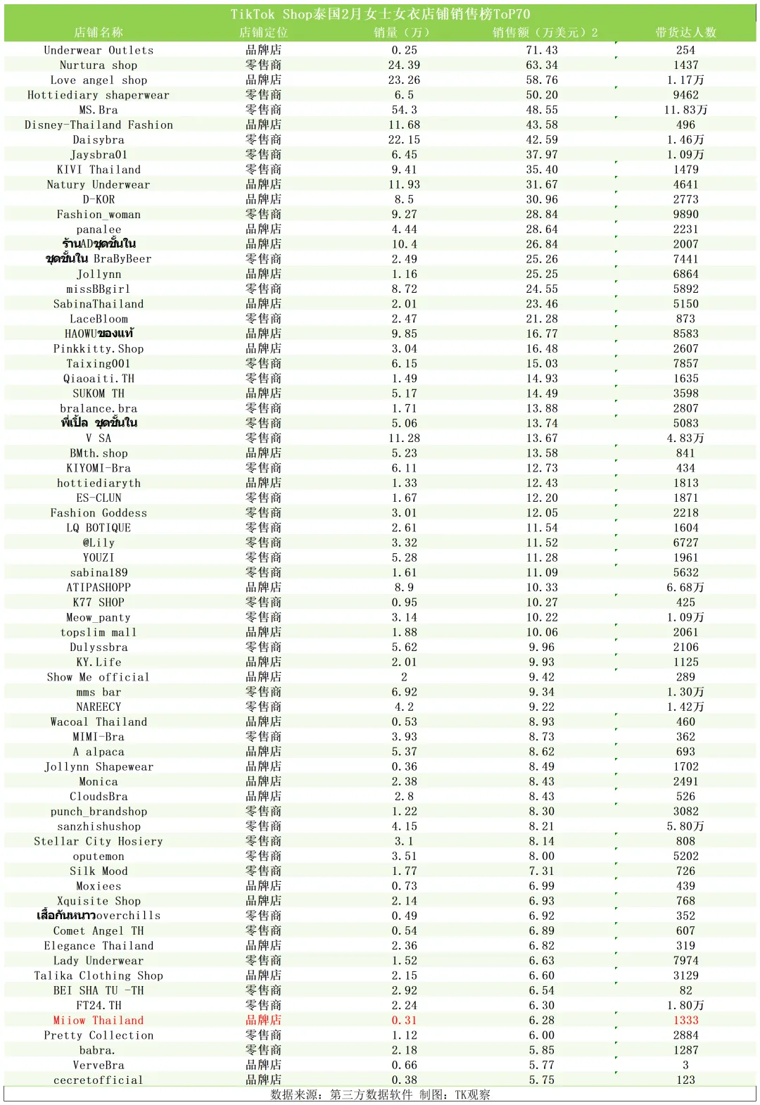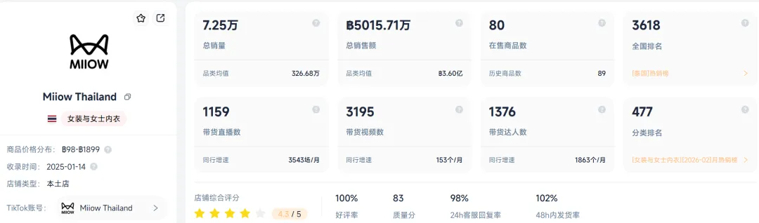 就TikTok泰国二级类目女士内衣店铺销售榜来看,@MiiOW Thailand店铺位列第66位,虽位列畅销榜末尾,但其产品单价却极具竞争力。TK观察发现,在TOP70店铺中,仅排名第一位的@Underwear Outlets(主营CK等国际知名品牌)内衣单价高于猫人,其余绝大多数店铺的内衣单价均低于猫人品牌,这直观的表明,在普遍追求性价比的TikTok泰国,MiiOW已凭借“科技内衣”定位成功跳脱出低价竞争区间,建立起属于店铺的品牌声量优势。