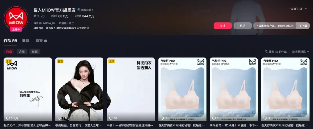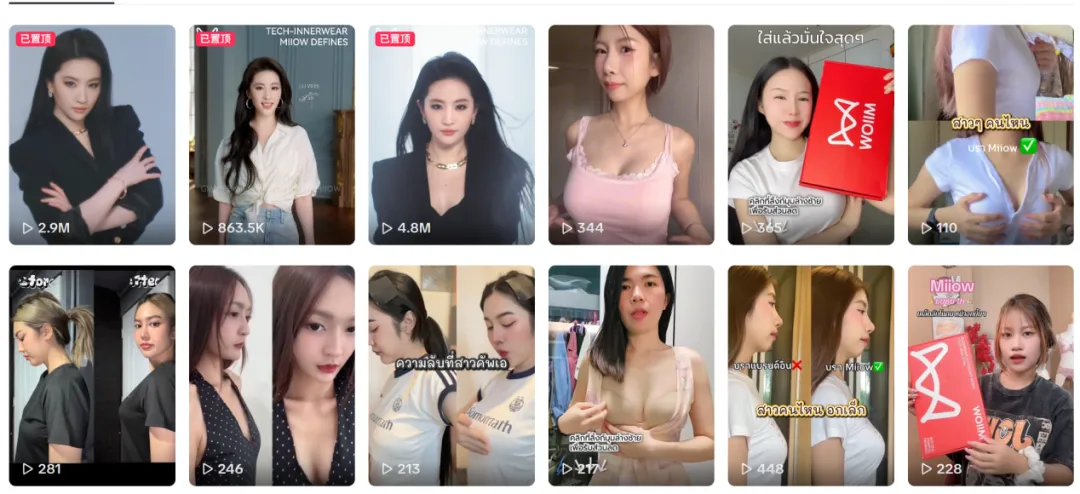 就当前阶段来看,猫人泰国官方账号@miiowthailand已积累2.8万粉丝,内容以本土达人体验和产品功能展示为主,尚未形成国内那样的账号矩阵。在内容调性和表现上,泰国官号与国内官方账号同样形成较为明显的差异。国内猫人官方账号更侧重于品牌价值、明星同款以及生活方式的传递,内容风格更为统一且质感更高;而泰国官号则更偏向直白、高效的产品功能展示,通过本土达人穿上前后对比、效果展示等直观呈现内衣产品的舒适度以及版型适配等主要卖点,让用户快速建立起对“猫人科技内衣”的认知。