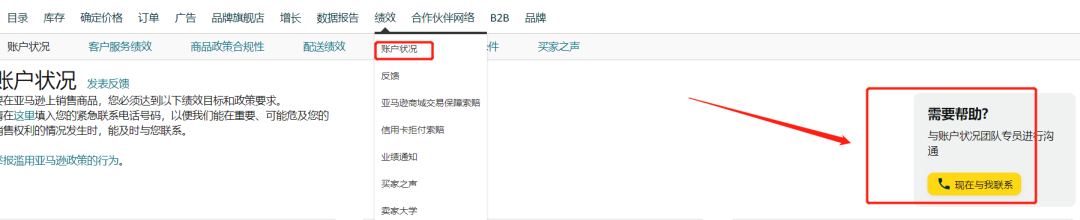 但是,有一点很清楚,如果自己的账户后期遇到了问题,通过点击这个黄色的按钮“现在与我联系”,是可以快速的联系到相关亚马逊团队的。