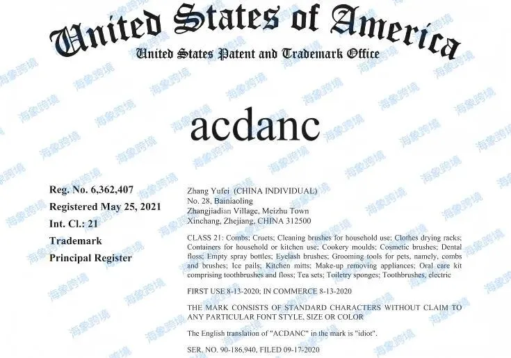原告是一家英国公司,原告名下 ACDANC 商标注册在第21类厨房洁具:梳子;调味瓶;家用清洁刷;晾衣架;烹饪模具;化妆刷;牙线;空喷雾瓶;睫毛刷等。