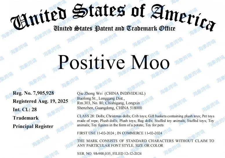 本案为国人原告,从事娃娃、毛绒玩具及相关产品的设计、制造和销售。案件涉及商标 Positive Moo 注册在第28类:娃娃;毛绒玩具;布娃娃;填充玩具;宠物玩具等。请相关卖家注意排查避雷!