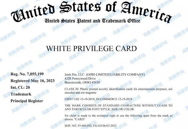 案件涉及商标 WHITE PRIVILEGE CARD 意为白人特权卡,这并非是一张真实存在的实体卡片或官方文件,而是一个用于讽刺和引发讨论的虚构概念,旨在揭示白人特权这一社会现象。案件涉及商标注册在第20类:印刷新奇的塑料身份识别卡,用于娱乐用途,非编码且非磁性。
