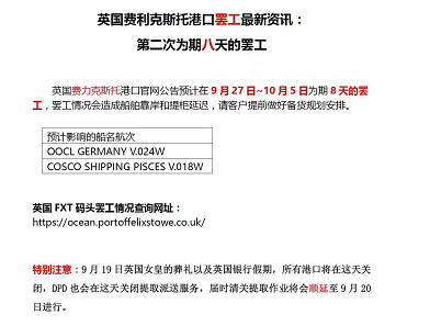 工会Unite将在 9 月 27 日 07:00 至 10 月 5 日 06:59 期间采取进一步罢工行动的通知,此次罢工预计同样为期8天! 在联合工会Unite与费利克斯托港运营商和记黄埔(CK Hutchison)之间的谈判失败后,联合工会Unite已确认费利克斯托港的工人将再次举行罢工。罢工将从9月27日至10月5日持续8天,这将与利物浦港从9月19日到10月3日的罢工重叠。 9月19日英国时间,英国女皇的葬礼以及英国银行假期,所有港口将在这天关闭,DPD也会在这天关闭提取派送服务,届时清关提取作业将会顺延至9月20日进行。