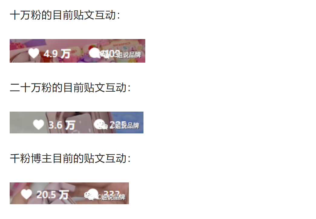 截图看出,千粉博主的帖子点赞20+w点赞,其他两个大V点赞分别是4.9w,3,6w个点赞,所以粉丝量的重要性从这里可见一斑。
