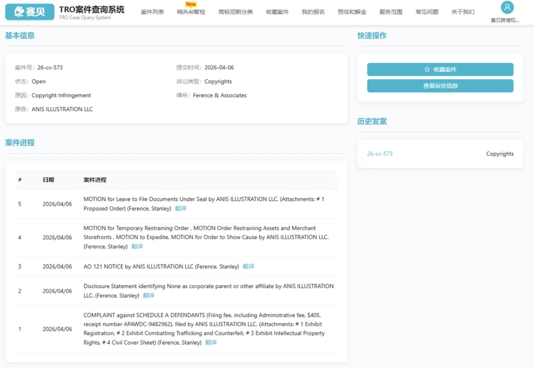 【26-cv-573】阿尼斯插画公司4张植物插画版权侵权TRO维权来袭,印刷品墙画壁画文具等衍生品跨境电商卖家速看。