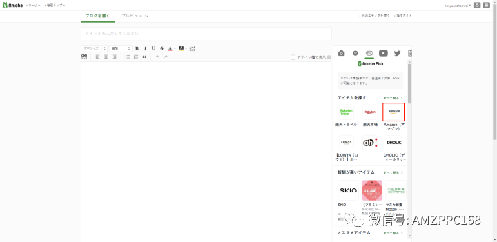 04/ Ameba Pick 通过后,我们“写博客”这里选择亚马逊,然后找到自己的listing 点击 Pick,最后配上软文就可以发布了