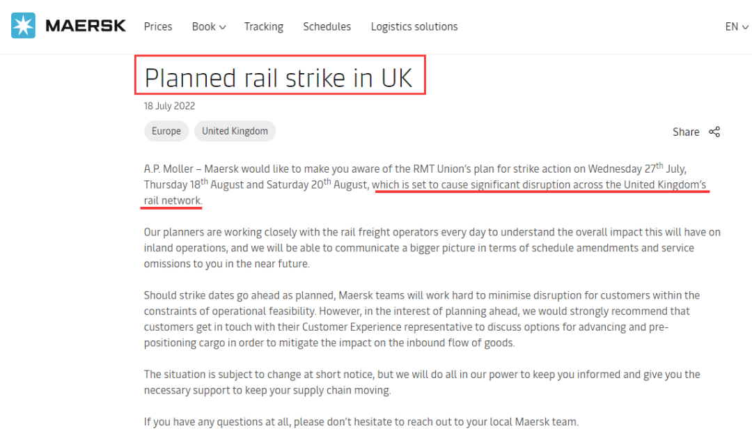 近日,马士基也已发布英国计划铁路罢工的相关公告表示,希望您了解RMT工会在7月27日、8月18日和8月20日的罢工行动计划,将给整个英国的铁路网络造成重大破坏。 马士基表示正在与铁路货运运营商密切合作,以了解这将对内陆运营产生的总体影响,将能够在不久的将来传达计划修改和服务遗漏情况。如果罢工日期按计划进行,马士基团队将在运营可行性的限制下努力减少对客户的干扰。