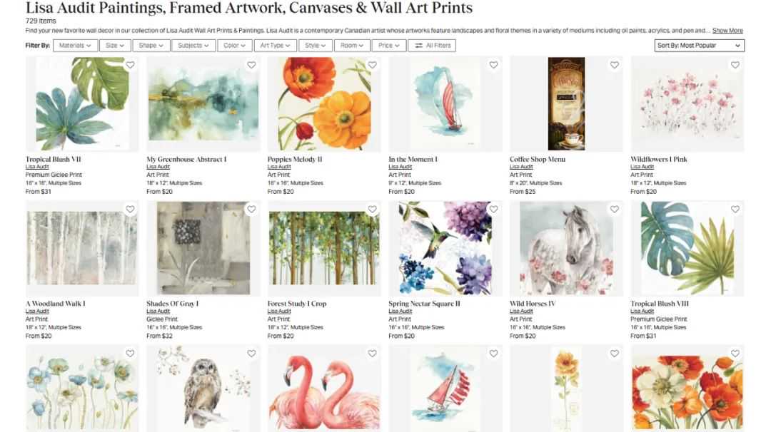 原告Lisa Audit 是一位来自加拿大的当代艺术家,擅长以花卉和自然风景为主题创作。她的作品风格清新浪漫,运用油画、丙烯、钢笔墨水等多种媒介,色彩明快且充满生命力。