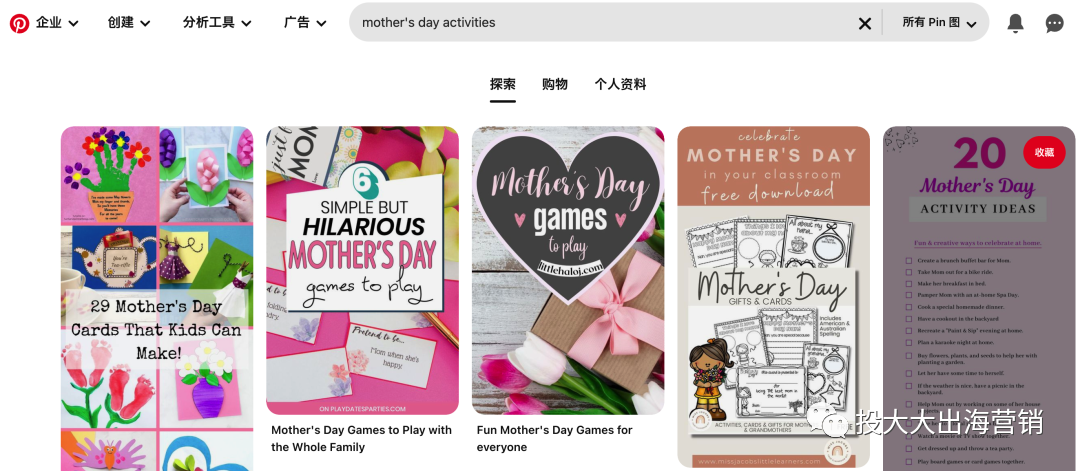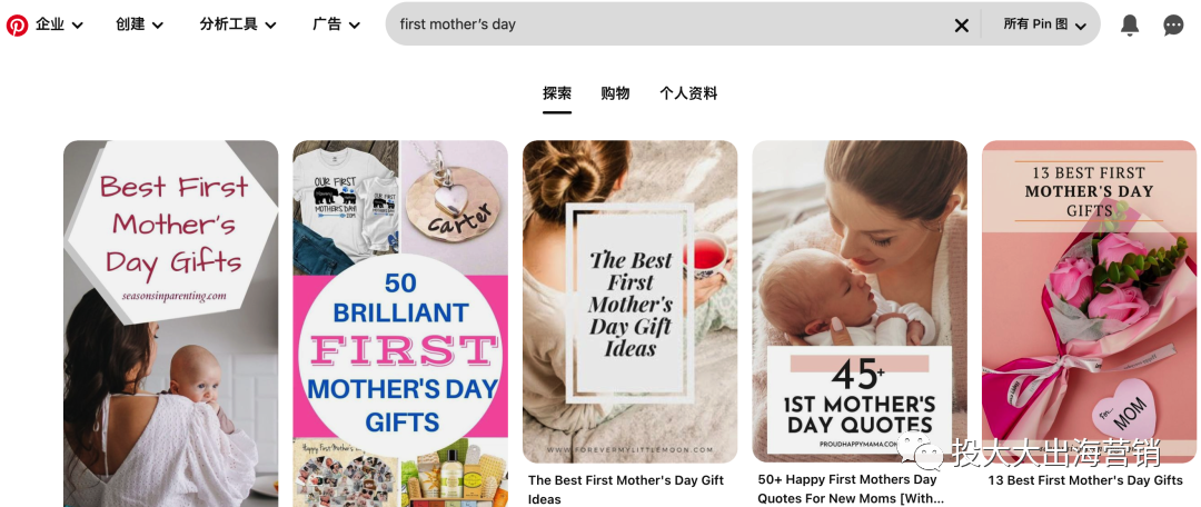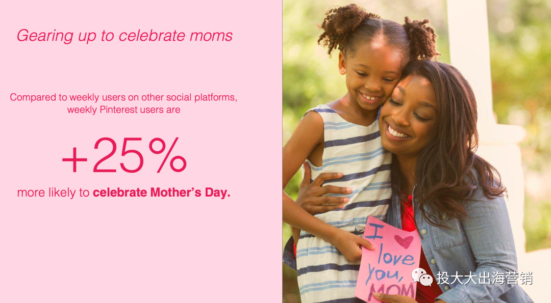 第三方调研机构的数据显示,常用的社交媒体之中,在Pinterest(可以理解为国外的小红书)上准备庆祝母亲节的用户量比其他社交平台用户量的均值多出25%。也就是说,Pinterest上愿意为母亲节花钱的用户更多,那么,以电商引流为导向,这个平台的用户搜索意图就更具有参考价值。
