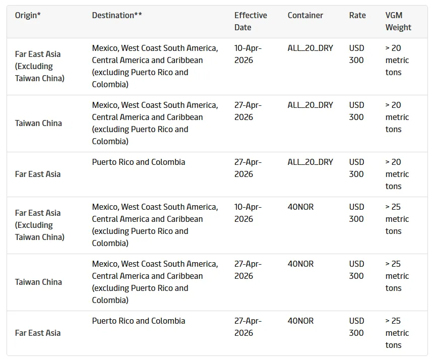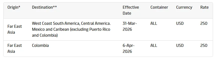 远东亚洲始发,去往南美西海岸、中美洲、墨西哥及加勒比地区(不含波多黎各、哥伦比亚),全箱型统一收费250美元,2026年3月31日生效;