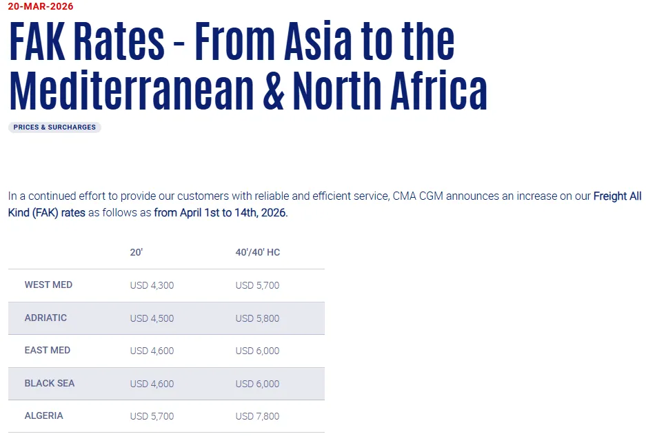 2026年4月1日至4月14日期间,从亚洲所有主要港口至全部地中海沿线港口(以下列明区域)的各类货物上调统一包干运价(FAK):