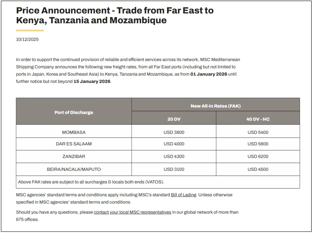 MSC12月10日发布公告:远东港口(包括但不限于日本、韩国及东南亚地区港口)至肯尼亚、坦桑尼亚及莫桑比克的新运费率。