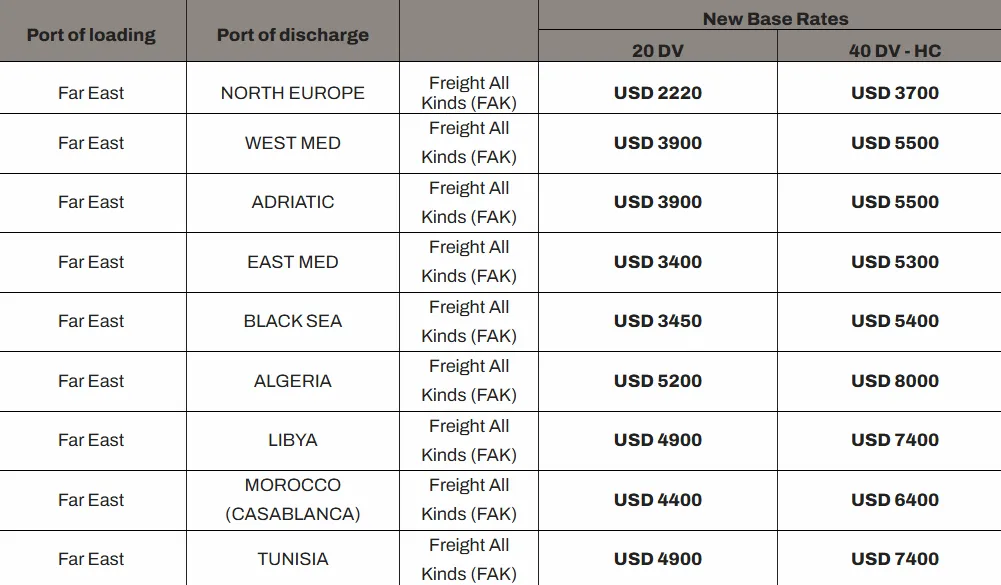 日前,MSC宣布,自2026年1月1日起(直至另行通知,但不超过2026年1月14日),从所有远东港口(包括但不限于日本、韩国和东南亚的港口)至北欧及地中海(含西地中海、东地中海、亚得里亚海和北非地区)与黑海港口的以下新运费费率生效。