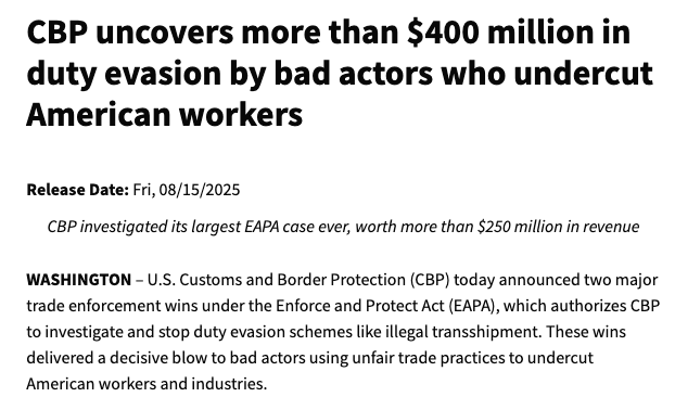 2025年1月20日至8月8日,美国海关及边境保卫局(CBP)通过《逃税法案》(EAPA)调查发现了超过4亿美元的未缴纳贸易关税。EAPA调查是阻止非法转运和其他旨在欺骗海关体系的计划的关键工具。同期,CBP发现了89起有合理理由怀疑逃税的案件。