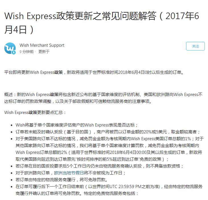 Wish平台即将更新Wish Express政策,新政将适用于世界标准时间2018年6月4日0时以后生成的订单。