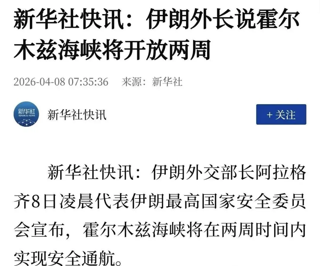 4月8日凌晨,伊朗外交部长阿拉格齐代表伊朗最高国家安全委员会宣布,霍尔木兹海峡将在两周时间内实现安全通航。