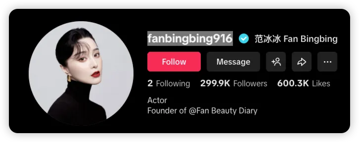 在此基础上,范冰冰于2024年入驻TikTok,并将东南亚作为主要的目标市场。截至目前,其账号(@fanbingbing916)已经积累了近30万粉丝,虽然其涨粉速度远远赶不上李连杰,但其在商业化道路走得更远。
