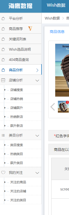海鹰数据针对wish数据主要从商品分析、店铺分析、类目分析这三个维度分析。