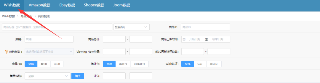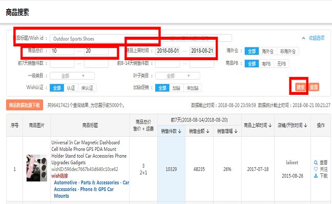第一步:在商品标题/wish id 输入商品名称,支持多个名称输入——设置商品总价——设置商品上架时间——设置是否有海外仓——设置销售件数——点击搜索
