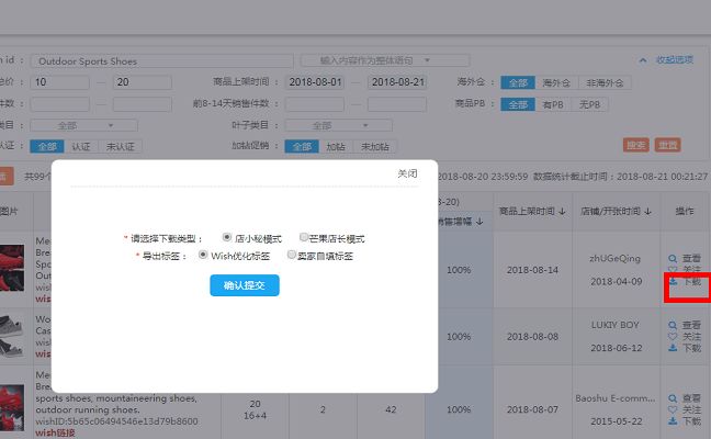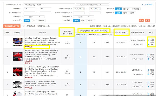 下面是海鹰数据搜索的结果,wish卖家可以很直观地分析Outdoor Sports Shoes 在2018年8月1号到8月21号,有哪些卖家上架了这类商品、商品定价多少、这段期间户外运动鞋销量如何。海鹰数据还支持在线打开产品链接和下载数据