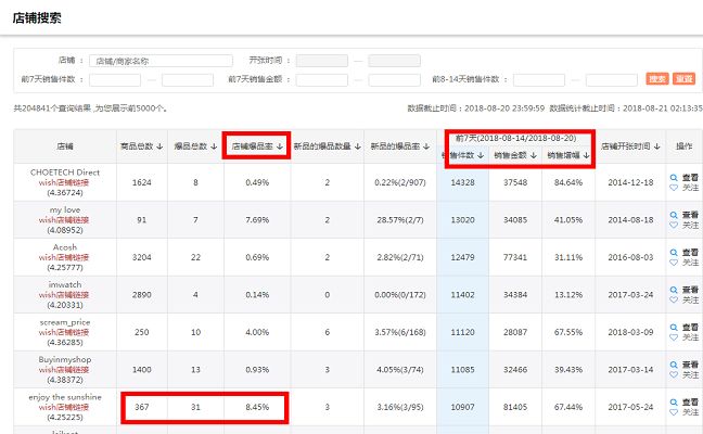 我们可以看出海鹰数据统计的wish店铺数据还是很全面的,选择爆款率高的店铺重点研究,参考目标店铺优化自己店铺产品图片、文字描述;分析下自己产品的定价是否有竞争力等等。