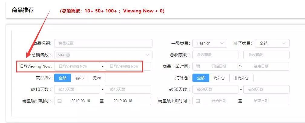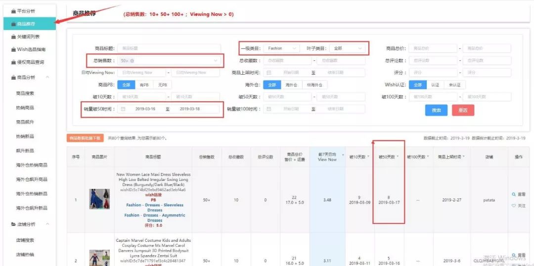 选择 Fashion类目;总销售件数为50+;商品在2019-03-16至2019-03-18总销售件数达到50件。