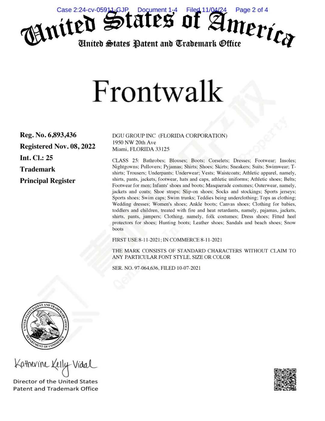 原告Dgu Group Inc.是一家位于佛罗里达州的公司,名下有一个名为“Frontwalk”的女装品牌,在沃尔玛品牌是best seller。