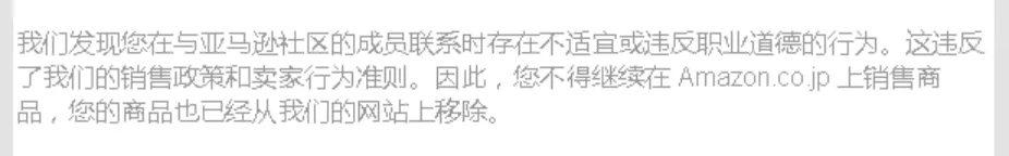 在官方邮件中,亚马逊明确指出,该卖家“在与亚马逊社区成员联系时存在不适宜或违反职业道德的行为”,已严重违反平台销售政策及卖家行为准则,因此被禁止继续在平台销售,店铺商品也被全部下架。
