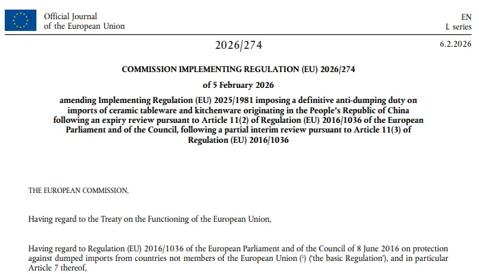 2026年2月6日,欧盟委员会发布官方公告,宣布对原产于中国的陶瓷餐具及厨房用具的反倾销税进行重大调整。