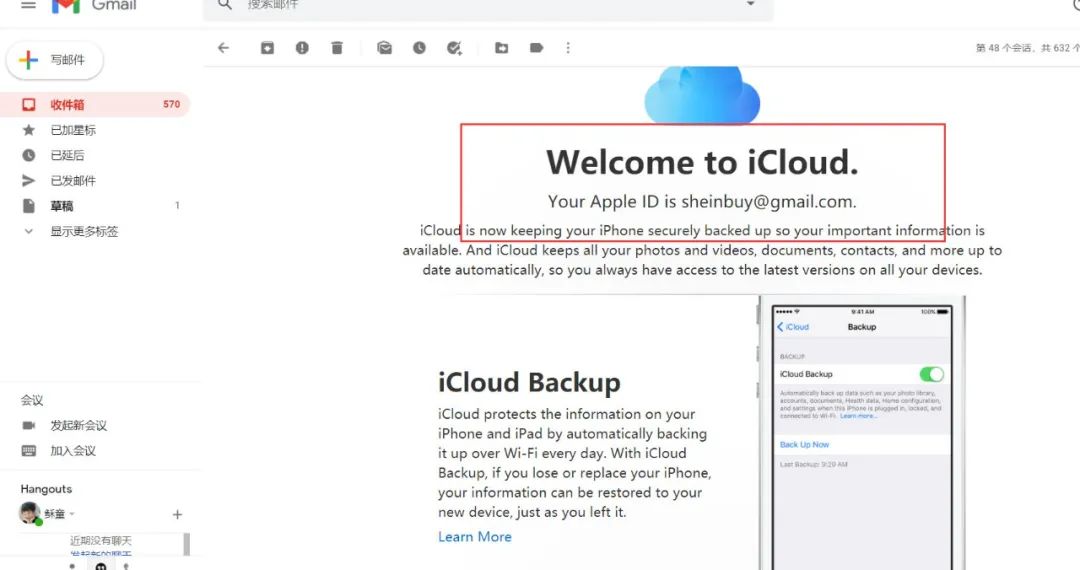 在你的邮箱还会收到一封提示欢迎你使用iCloud Backup邮件