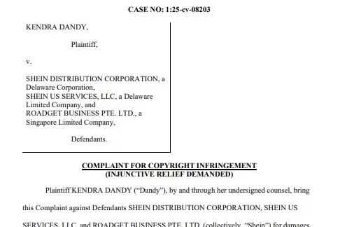 值得注意的是,这并非双方第一次对簿公堂。早在2021年,Dandy就曾因同类问题起诉Shein,该案于2022年2月达成和解。然而据诉状显示,2025年8月Shein再度涉嫌使用其作品,因而引发本次诉讼。