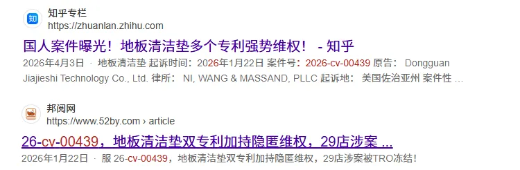 最近,一款地板清洁垫在美国发起了TRO维权(案件号:2026-cv-00439)