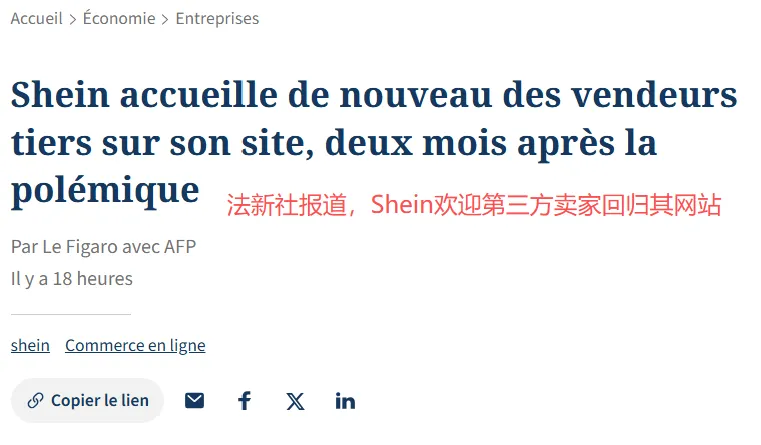 这标志着自去年11月因监管压力主动暂停第三方业务后,Shein在法国市场迎来了关键转折。