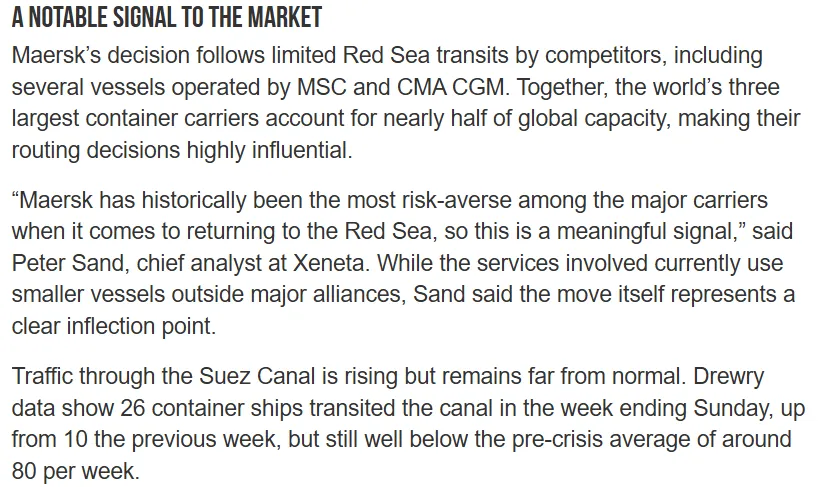 行业头部的财务数据已率先发出警报。根据2025年第四季度财报,马士基与ONE的息税前利润已转入负值区间。这一迹象表明,在红海危机彻底解除前,由于结构性过剩的本质依然存在,运价的削弱效应已经开始影响大型承运人的成本底线。随着未来苏伊士航线的回归,市场面临的通缩压力将比两年前更加严峻。