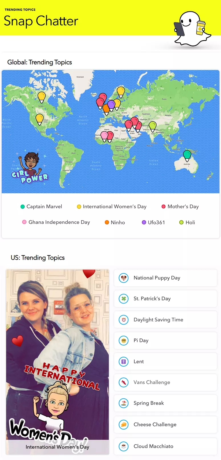 社媒热点在手,走遍天下不怕~~ 来看看这一周小帆给你带来什么消息! 1 Snapchat三月发布用户报告 2月份用户热门话题尽在其中 顶级社交媒体管理软件Statusbrew最近发布社交媒体应用数据报告,不仅更新了各大社媒的用户和营销数据,还分析了平台的商业潜力等。 从上图我们可以看到,Facebook的用户数量已经超过20亿,Twitter超过3.26亿,Instagram超过10亿,领英超过2.5亿,Pinterest超过2.5亿,Snapchat超过2.55亿,YouTube达到19亿……等等,其中微信和微博也榜上有名~ 报告还显示了: ① 不同端口使用社交媒体软件的用户数量 ② 利用社交媒体与品牌和零售商获得联系的用户比例 ③ 用户在目前所有知名社交媒体软件的具体使用时长 ④ 各大社交媒体的月活跃量、使用习惯、平台视频播放量等 …… 总之,全球最高人气、广告位最火爆的15个社交媒体平台的营销数据,这里全都有~ 想要了解报告全部内容吗?点击“阅读原文”,直接跳转! 2 Snapchat3月份最新报告 用户热点你知道! Snapchat三月份用户数据又出来了!这次我们又能get到什么热点呢~ 上图我们可以看到 ▼ 北美地区在三月份对妇女节的议论是最火爆的 地中海沿岸地区对母亲节、法国说唱歌手Ninho、加纳独立日等话题尤为热衷,澳洲地区则是对漫威最近新电影“惊奇队长”热议不断! 同时,在全美3月最热门的话题TOP9是 ▼ 国际狗狗节 爱尔兰国庆节——圣帕特里克节 夏令时 圆周率日 大斋节 Vans运动鞋挑战 春假 芝士挑战 星巴克新品咖啡Cloud Macchiato 3 网红营销大数据 为你的2019网红营销作参考! 最近,著名的网红营销公司Influencer Marketing hub公布了一系列有关网红营销的数据,小帆总结了一下几个借助网红力量营销的重要数据▼ 每花1美元,就能获得平均5.2倍的媒介价值 每花1美元,就能获得平均1.8倍的直接回应ROI 每花1美元,电商营销活动就能有大约80美分的返点 近三年,光是在Google,“网红营销”一词的搜索量就有1500%的增加 …… 2016-2018年,创业公司在网红营销上的总预算投入逐年增加,从全年投放6900万美金到2018年全年总投放金额达1.72亿美金 网红营销的效果让大小商家趋之若鹜,但是选择高人气网红还是微型网红?选择什么风格的网红?哪里找最全的网红资源……小帆就打个小广告好了~ 我们The Gurus红人网络有各领域不同粉丝数量的网红,总能找到适合你品牌的那位哦! 大家如果对以上哪则新闻 有兴趣想深入了解的, 可以联系小帆, 小帆可以为你撰文深度介绍哦~ 下周四见!