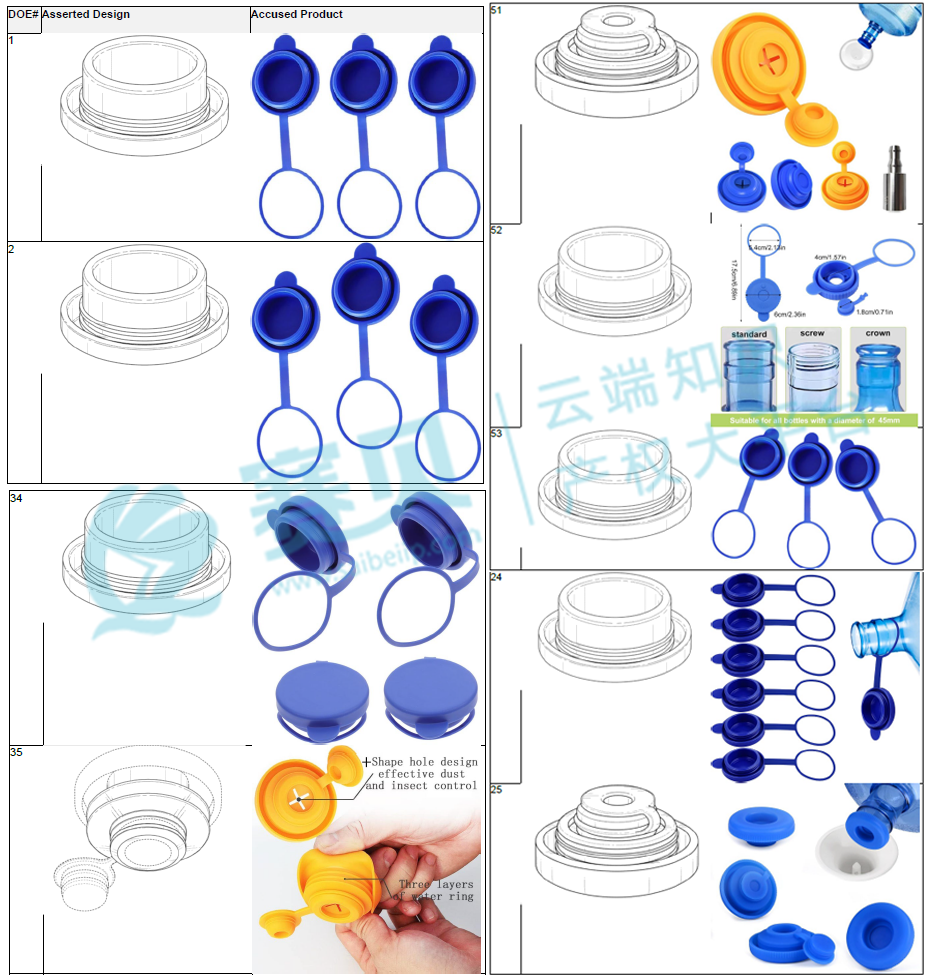 案件涉及三项美国设计专利,分别是:USD977973、USD979404、USD979404,均为容器塞的装饰性设计。赛贝提醒,未经授权,任何卖家都不得使用与上述设计专利相同或相似的设计,否则可能构成侵权。