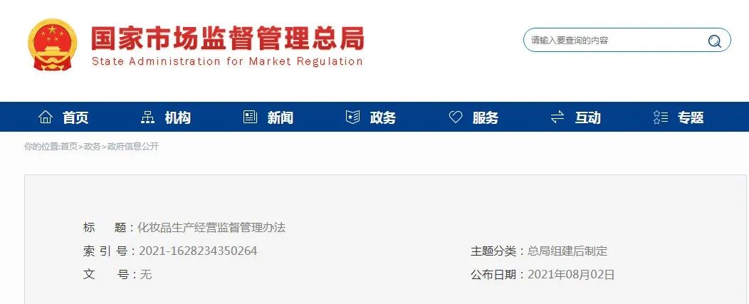 《化妆品生产经营监督管理办法》已经2021年7月26日市场监管总局第12次局务会议通过,现予公布,自2022年1月1日起施行。
