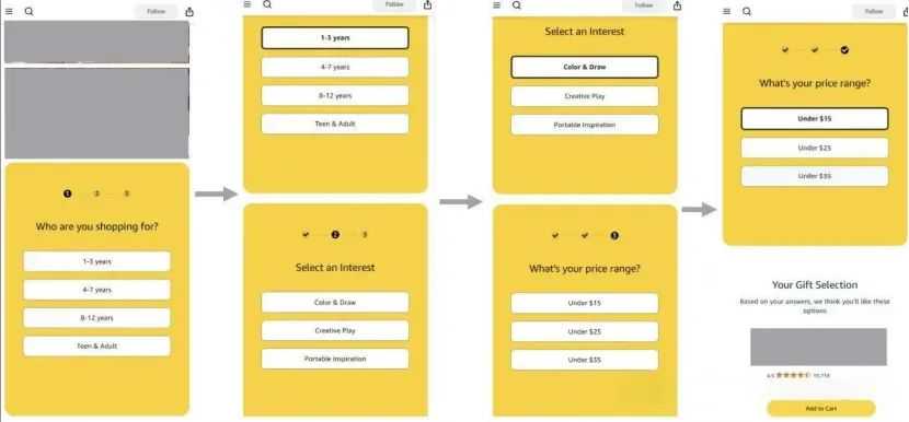 “商品选择器”,简单来说,就是卖家提前根据自家产品的特性、功能、适用场景等,设置一系列相关问题。买家一进入品牌旗舰店,回答完这些问题,系统就能按照卖家设定的规则,快速、精准地筛选出符合买家个性化需求的产品。