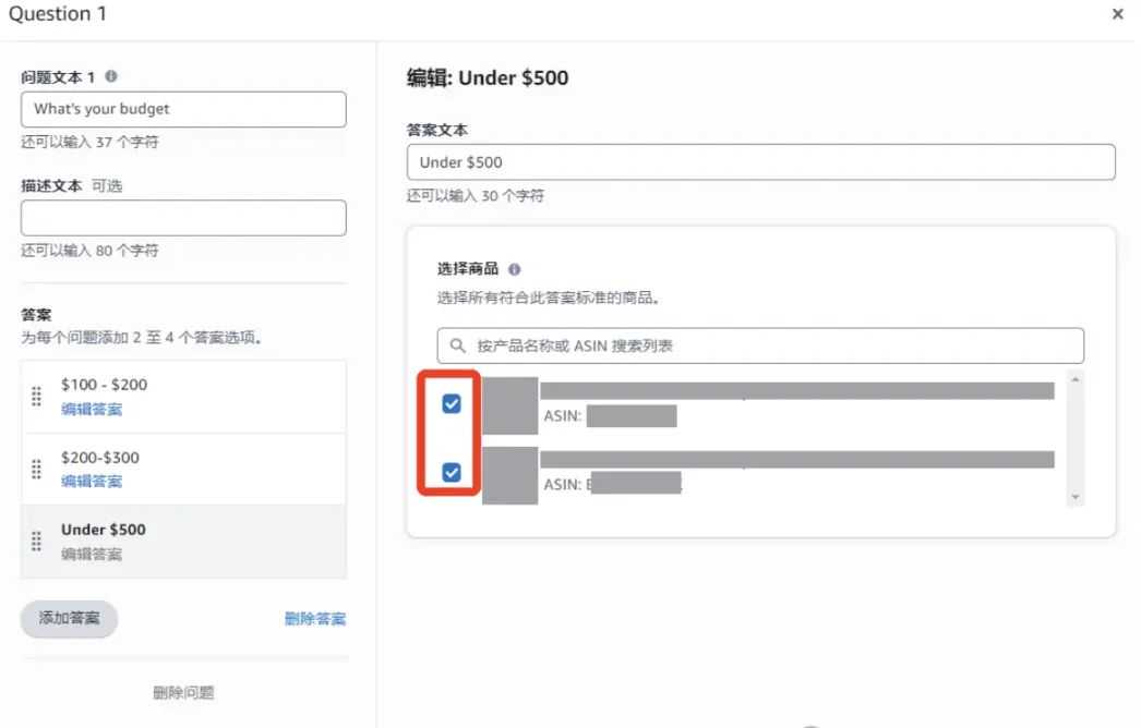 ② 在编辑问题的时候,最多能设置 3 个问题,当然只设置 1 个也没问题。一个答案可以对应 1 个或多个 ASIN。要是只设 1 个问题,买家回答完马上就能看到推荐产品;要是设 3 个问题,就得全部答完才会出推荐。而且问题表述得通俗易懂,别整那些专业术语,让买家看得一头雾水。答案选项得全面、精准,把各种可能的情况都涵盖到。