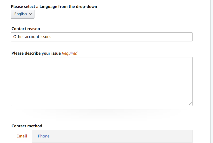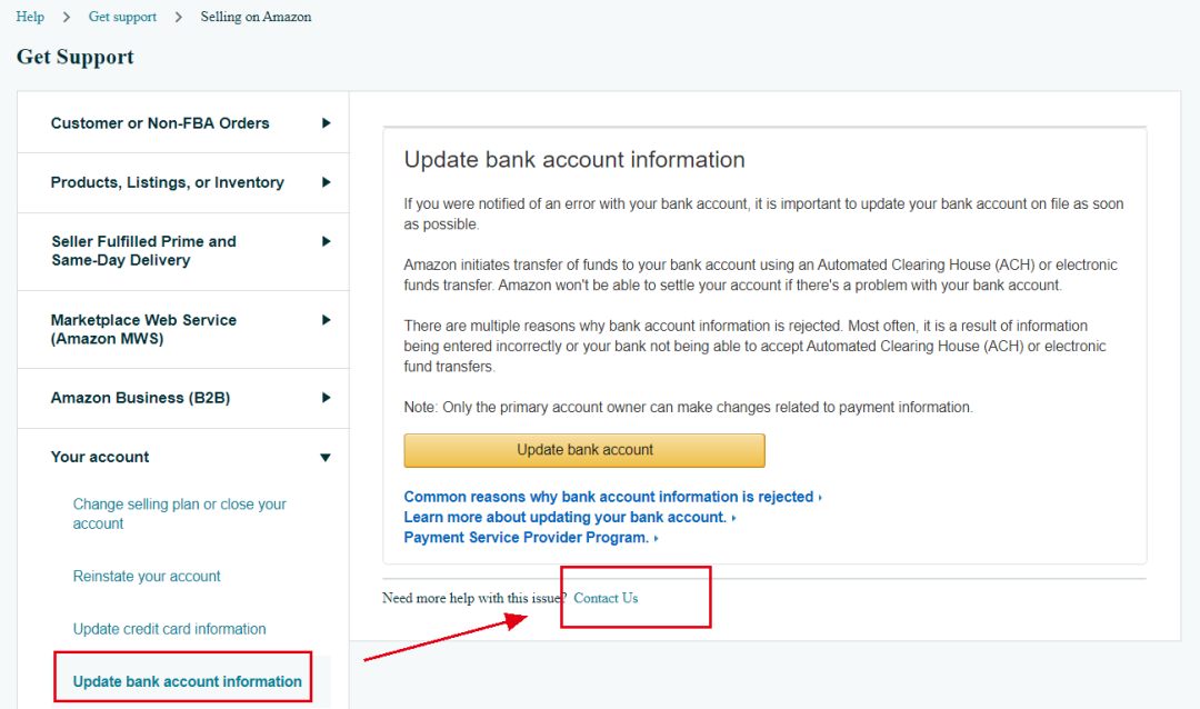 Help》Get support》Selling on Amazon》Your account》Update bank account information》Contact Us