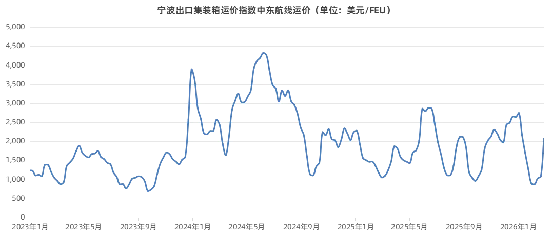 根据宁波航交所发布的海上丝路指数・宁波出口集装箱运价指数数据显示,2 月 27 日中东航线运价指数报 1129.6 点,较上周上涨 82.2%,涨幅已超过 2022 年疫情初期水平,实际运价攀升至 2075 美元 / FEU。若中东航线存在紧急货物或高价值货品必须出运,预计运输成本将大幅走高,部分渠道报价或突破 4000 美元 / FEU。