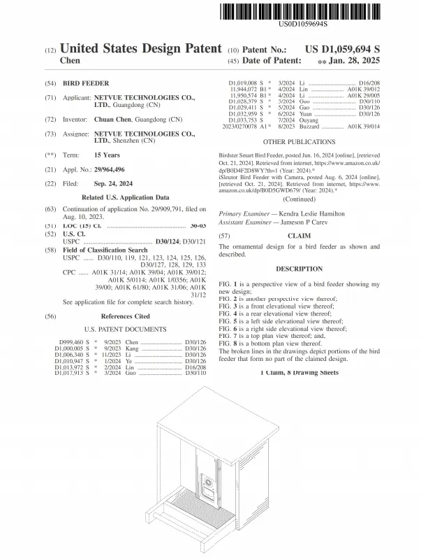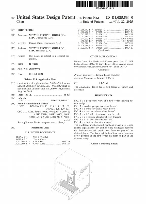 原告NETVUE TECHNOLOGIES CO., LTD是一家诞生于 2010 年的深圳“硬科技”公司,在美国加州 Pasadena 设有子公司,专注把 AI 装进安防与观鸟场景。2020 年推出子品牌 Birdfy,用“带摄像头的智能喂鸟器”把客厅变成移动观鸟台,凭颜值与黑科技登上《TIME》2025 年度创新榜单。手握三项美国外观设计专利,其 Birdfy 系列已成为北美鸟友心中的“颜值神器”。