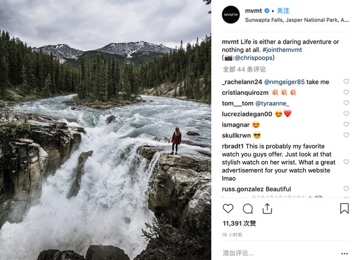 如果要提曾经在Instagram上一夜爆红的品牌,那么手表品牌MVMT一定不能错过。它在Instagram上的内容营销不仅仅围绕着产品宣传,而宣扬一种勇于冒险的生活方式。它推出了jointhemvmt的词条,使得用户可以加入自己的品牌社群。现在,MVMT在Instagram上的粉丝数量超过了百万,每条推文的点赞数都超过了万次。