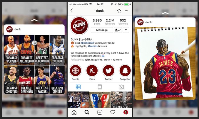 DUNK是一个用户参与度极高的篮球社群,而它在Instagram上的粉丝已经超过了200万人次。它在Instagram上传的内容质量也是十分之高,不仅包含目前正在进行的篮球赛事,也包括粉丝上传的高质量的图片等等,比如粉丝手绘的篮球球星图片。