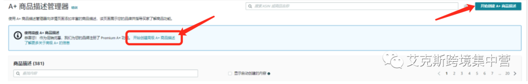 搜索ASIN或商品名称,或点击“开始创建A+商品描述”,选择“创建高级A+”。