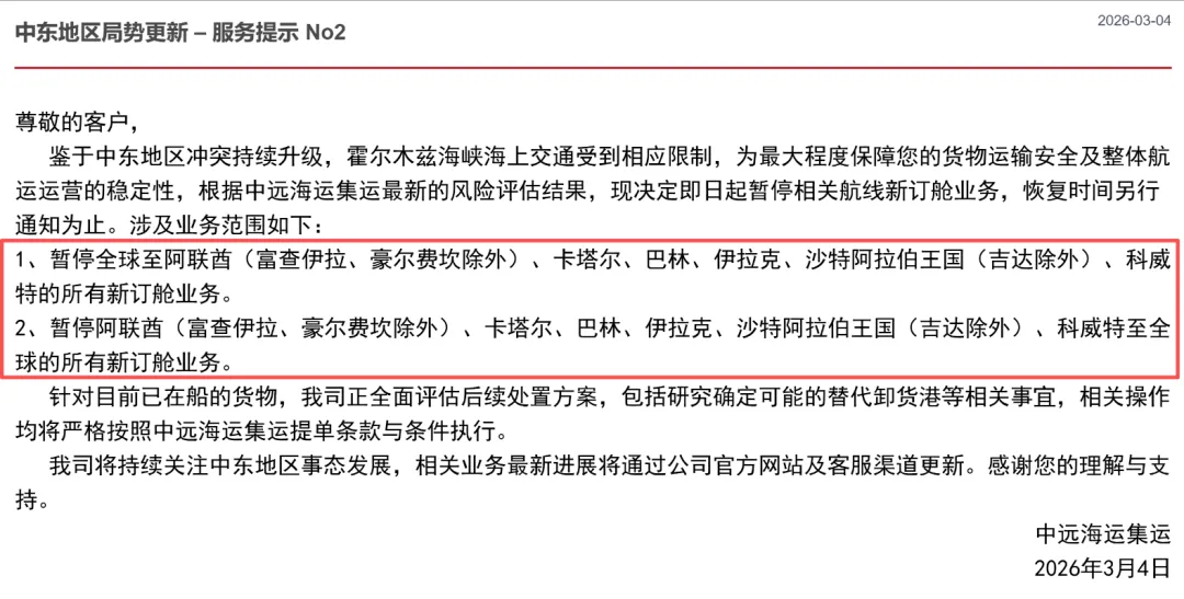 鉴于中东冲突升级、霍尔木兹海峡海上交通受限,中远海运集运为保障货物运输安全与航运稳定,依风险评估即日起暂停全球至阿联酋(富查伊拉、豪尔费坎除外)等国,以及这些国家至全球的所有新订舱业务,恢复时间待通知,同时正全面评估已在船货物的处置方案,将按提单条款执行。