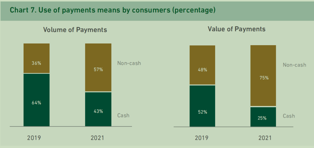 2021年年中,消费者使用非现金支付占总支付量的57%,同比上涨21%,金额占总金额的75%,同比上涨27%。
